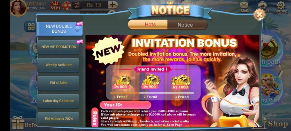 Referral System: Share your referral code with friends and family. Every time they join and play, you earn bonuses.